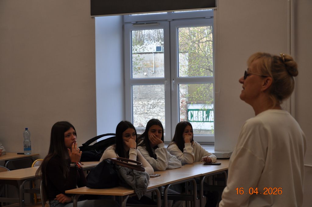 Uczestnicy polsko – hiszpańskiej wymiany młodzieży uczestniczyli w warsztatach kulturoznawczych „Polish symbols and culture” przygotowanych przez nauczycieli języka angielskiego, p. Agatę Berezecką i p. Katarzynę Lipert, oraz uczennicę klasy II b – Karolinę Błaszczuk. Pierwszym elementem spotkania była prezentacja, dzięki której uczestnicy zdobyli wiedzę o polskiej fladze, godle i hymnie, a także o słynnych Polakach i ważnych miejscach czy tradycjach. Kolejna część zajęć poświęcona była wykonaniu przez uczestników wymiany plakatów przedstawiających mapy Polski i Hiszpanii. Na zakończenie młodzież uczestniczyła w quizie, który pozwolił sprawdzić zdobytą wiedzę.